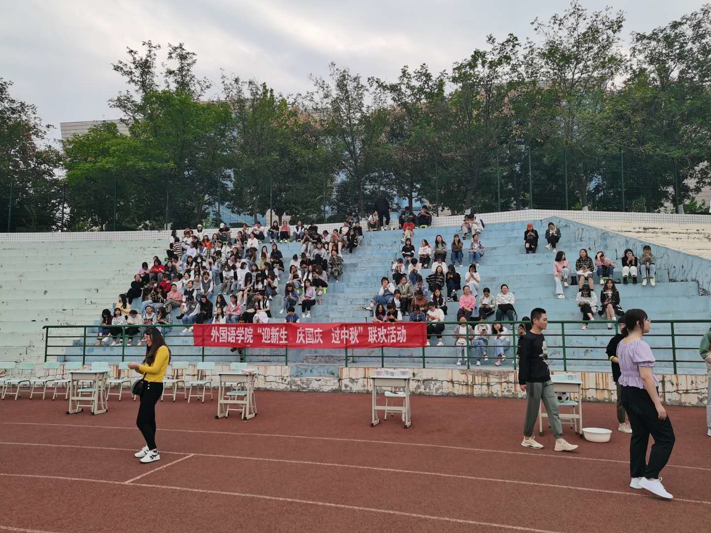 (通讯员 张雨梦 郭清连)2020级新生军训之际,国庆中秋喜相逢,举国欢庆月更明。10月1日,国庆与中秋双节到来之际,古天乐太阳集团城在田径场组织新生开展“迎新生、庆国庆过中秋”联欢活动。古天乐太阳集团城院长秦平新、副院长秦小锋、辅导员靳真真、新生班主任和全体大一新生参加了此次活动。