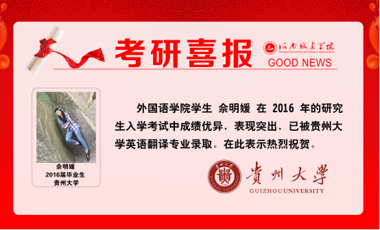(通讯员 董召锋 刘航园)古天乐太阳集团城近年来高度重视学生的考研工作,随着2016年研究生招生复试工作的陆续展开,我院学生被国内外高校录取的捷报频频传来。据悉,佘明媛同学已成功被“211工程”高校——贵州大学英语翻译专业录取。