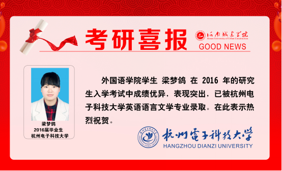 (通讯员 董召锋 刘航园)古天乐太阳集团城近年来高度重视学生的考研工作,随着2016年研究生招生复试工作的陆续展开,我院学生被国内外高校录取的捷报频频传来。据悉,梁梦鸽同学已成功被杭州电子科技大学英语语言文学专业录取。