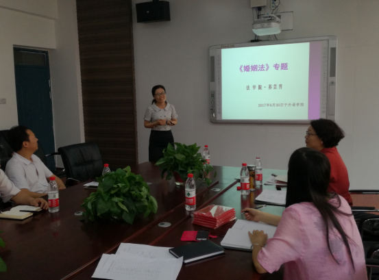 (通讯员 张换成)为使教职工更深一步了解新婚姻法,倡导平等、和睦、文明的婚姻家庭关系,普及有关婚姻家庭的法律知识,增强教职工依法维权的意识,6月30日上午,我院邀请武汉大学博士生、法学院教师苏芸芳在会议室做了一场关于《新婚姻法》专题的普法讲座。学院党总支书记袁晓、院长秦平新、党总支副书记于修涛、副院长董星华和全院教职工一起聆听了讲座,讲座由董星华主持。