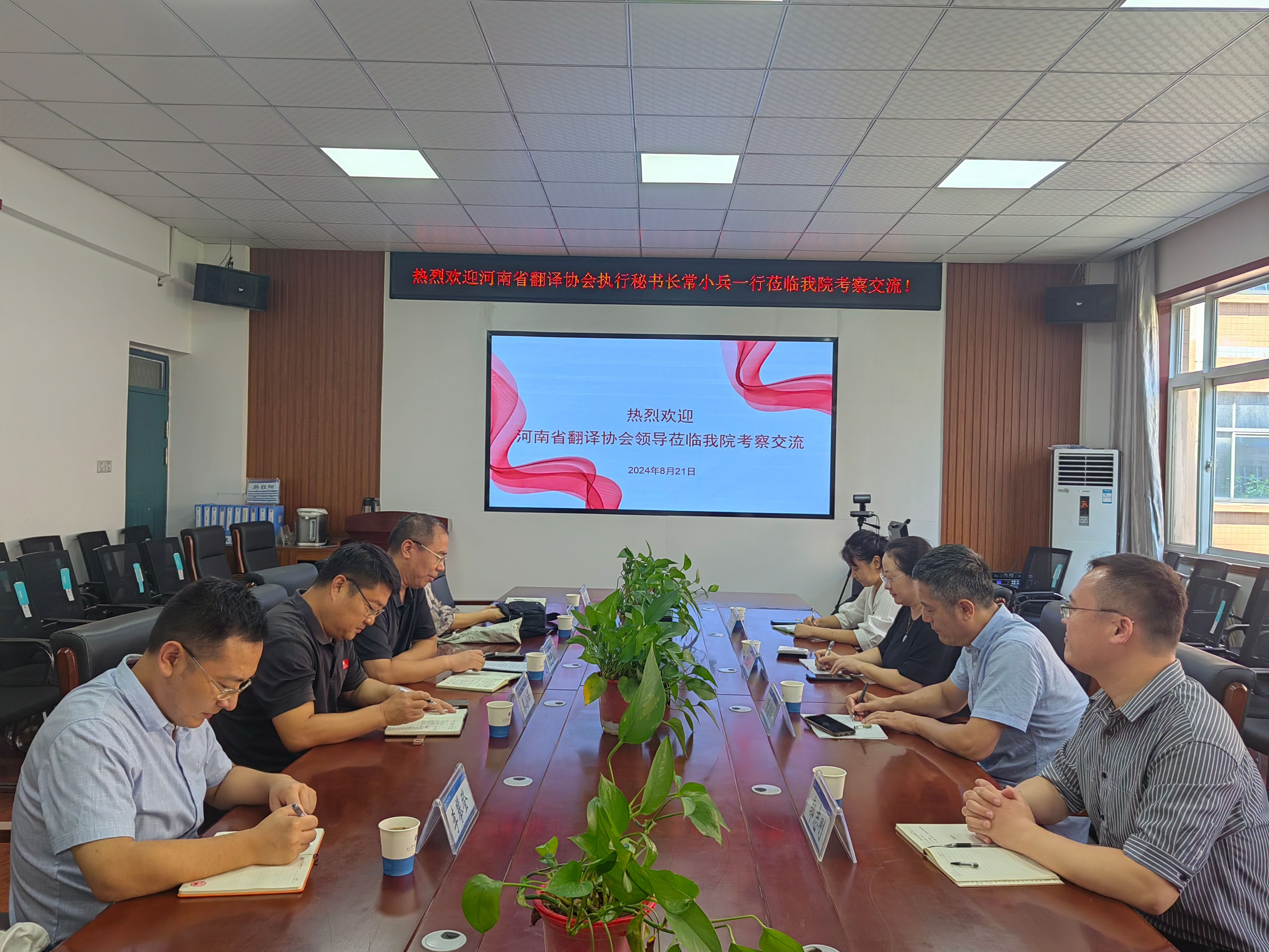 8月21日上午,河南省翻译协会执行秘书长常小兵、张凤杰,秘书处工作人员郭志刚、马荟哲一行莅临我院考察交流。古天乐太阳集团城院长张换成、副院长秦小锋、科研与校企合作办主任张湘雨、工程英语智能翻译与语料数据中心主任李攀登和教师代表张香宇参加交流。会议由秦小锋主持。