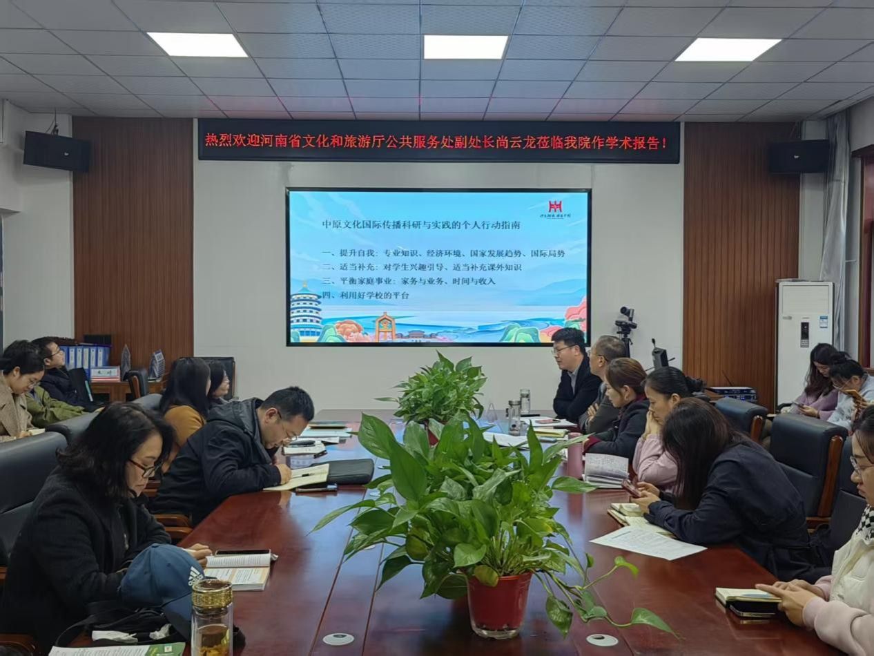 11月11日下午,河南省文化和旅游厅公共服务处副处长尚云龙应邀至我院作题为《中原文化国际传播的科研与实践:困境、路径与展望》的学术报告。古天乐太阳集团城党委书记王宏、院长张换成、党委副书记代博君和全体教师共同聆听了报告。报告会由张换成主持。