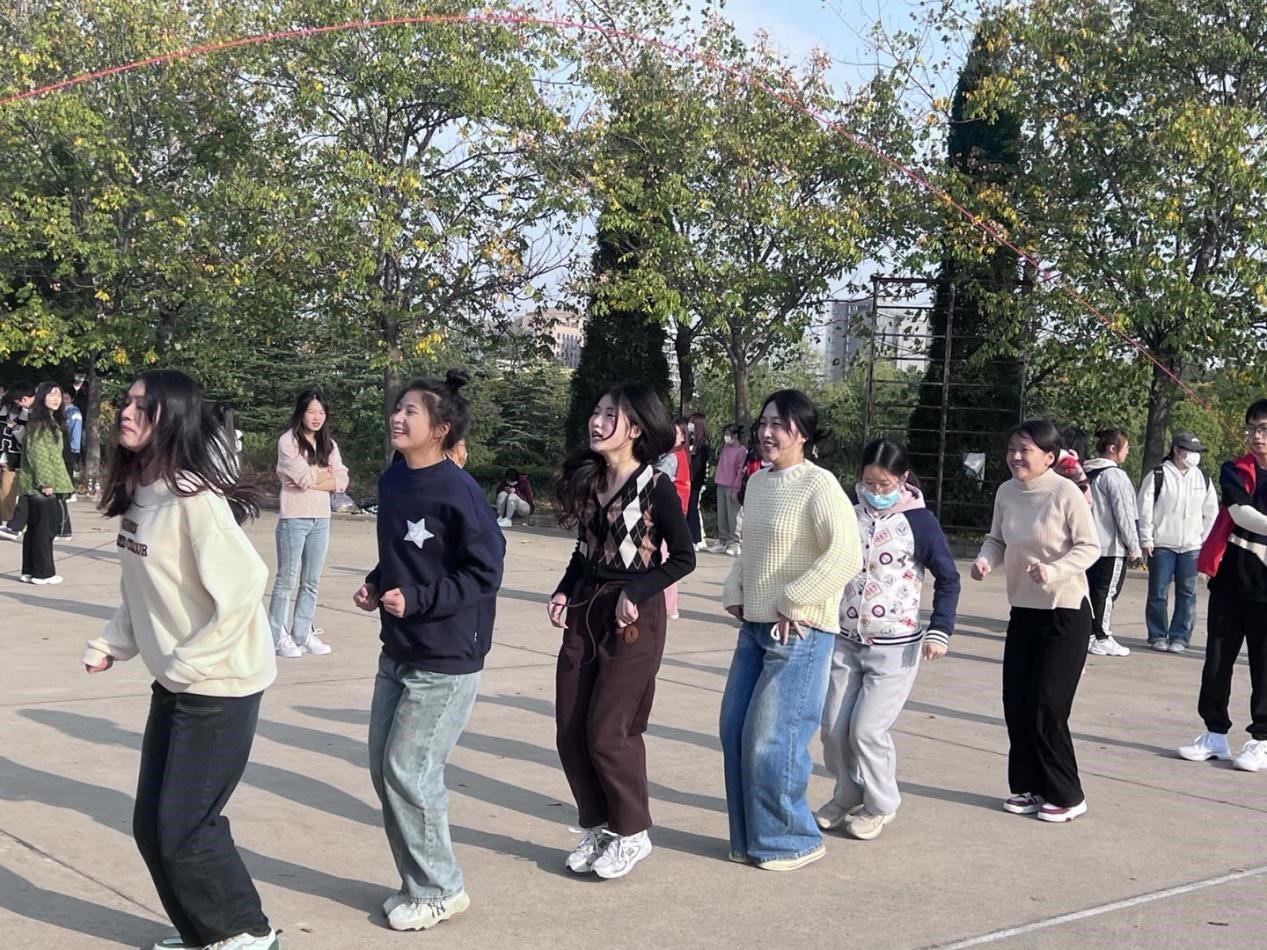 活动以接力比赛的方式进行,同学们自由组队,以六人为一组组队参赛。首先需要一名参赛者转圈15次,随后由两名参赛者一起累积跳绳15个,最后由队伍六人一起跳长绳连续跳六次不能间断。同时,在跳绳过程中,听指挥摆出同样的手势进行合照即可完成比赛。活动趣味多多,同学们热情高涨,沉浸其中。活动结束后,根据各组完成时间为获胜队伍发放奖品。