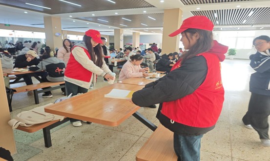 活动现场,志愿者们分工明确、热情投入:有的在取餐窗口旁引导同学按标识有序排队,避免拥挤插队;有的在就餐区提醒同学用餐后整理餐具、擦拭桌面,保持座位整洁;还有的主动协助食堂工作人员清理餐余垃圾、规整公共区域物品,用行动传递文明理念。